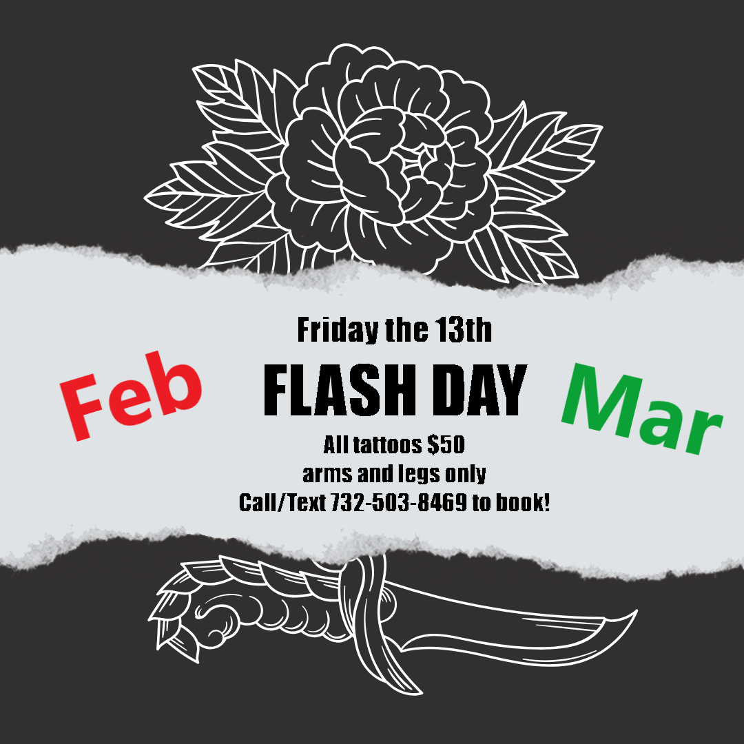 A sneak peek of our all new Friday the 13th flash is posted to the flash tab on the website. Check it out, call/text 732-503-8469 for an appointment and guarantee yourself a spot!