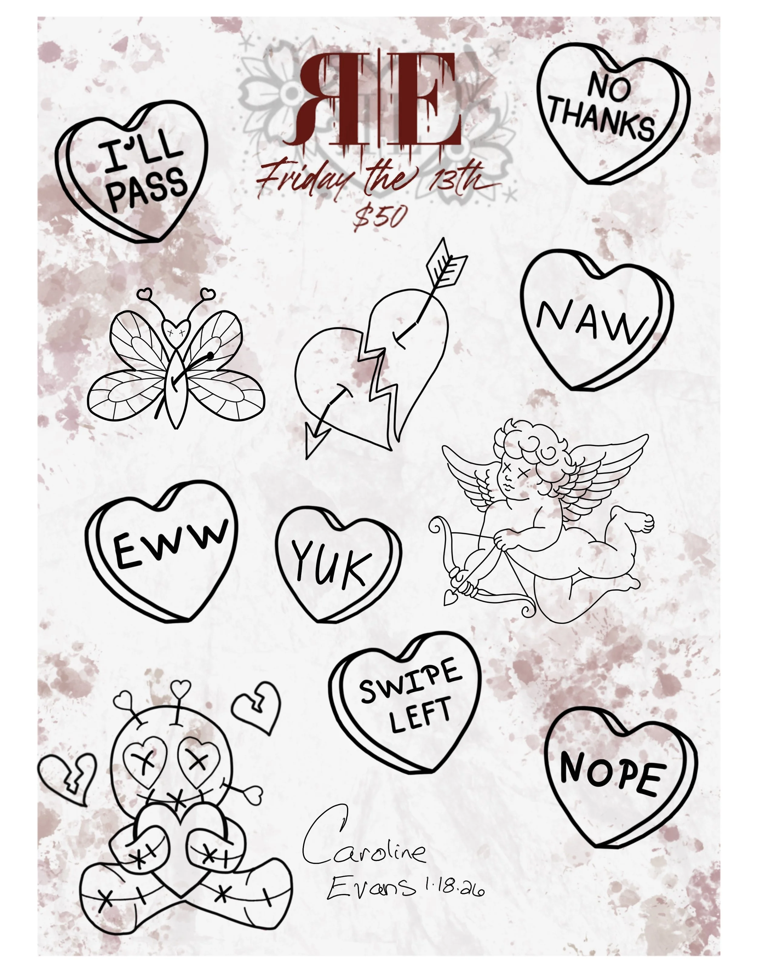 Are you single? We are not having a Valentine’s Flash Day this year since Friday the 13th is the day before, BUT you can still get your anti-Valentine’s Day tattoo! There is a whole page of anti-Valentines tattoos available for Friday the 13th. Call or text 732-503-8469 to book.