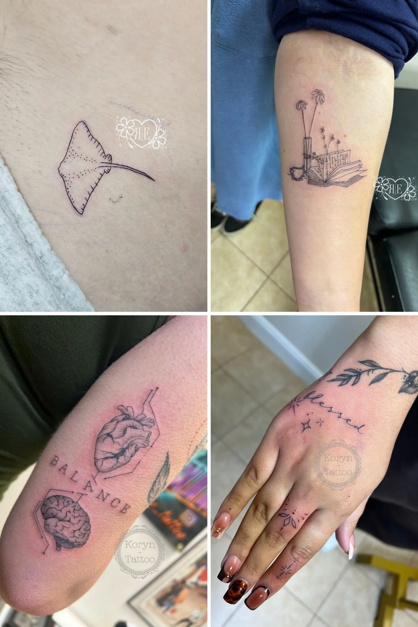 Thinking about a fine line tattoo? Look for an artist whose portfolio shows a mastery of delicate detail and healed examples of their work. Precision is everything in this style—and the right artist makes all the difference. The tattoos accompanying this article were done by Caroline, Koryn, or Casey.